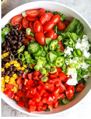 Lettuce, Tomatoes, Red Bell Pepper, Black Beans, Corn, Jalapeno, Quinoa, Green Onion, Cheese